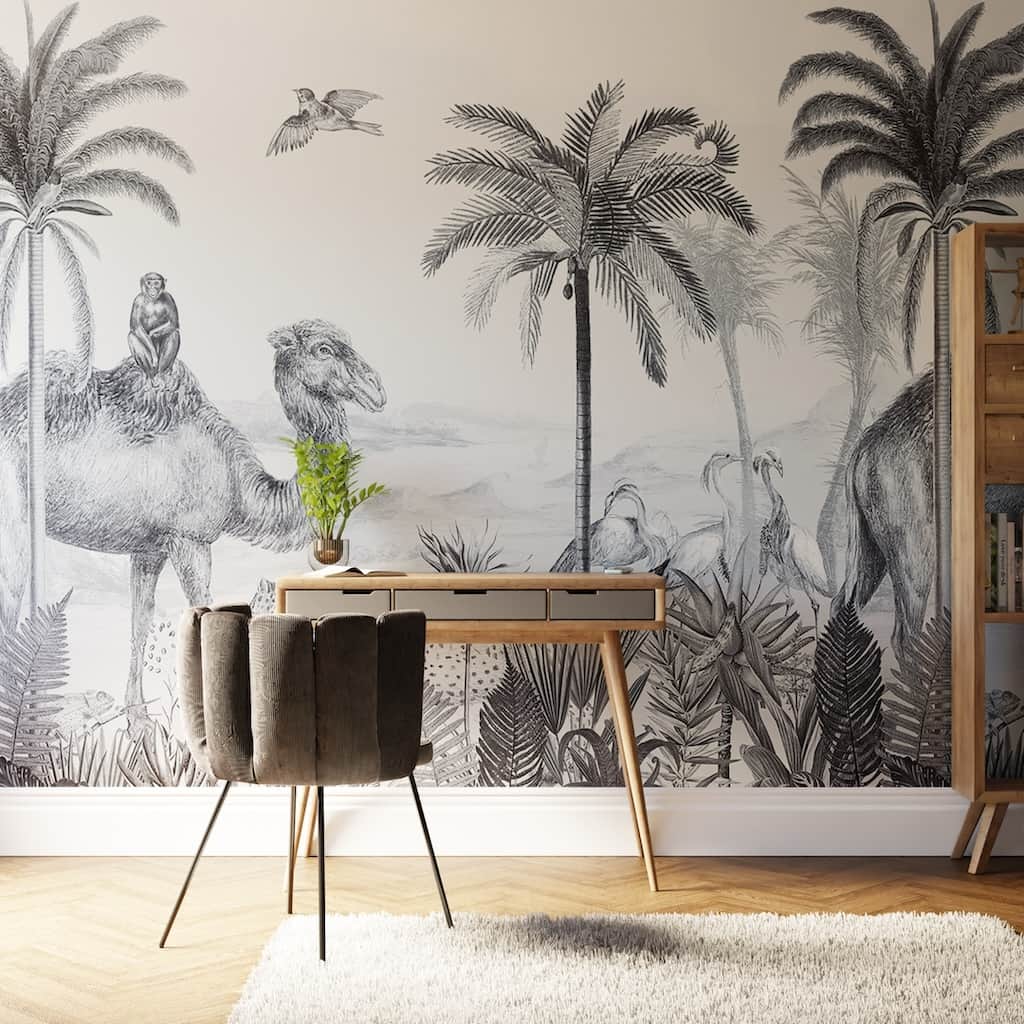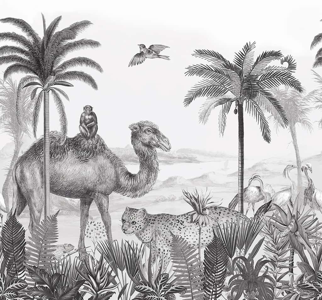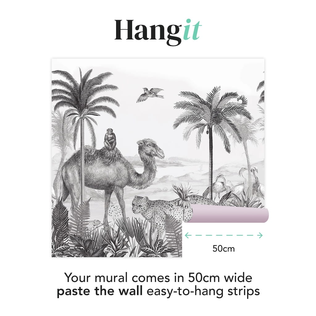 Become part of the animal kingdom with this beautiful illustrative mural. Featuring a menagerie of animals set against a tropical backdrop this monochromatic bespoke mural would be ideal for children's bedrooms, playrooms and beyond.