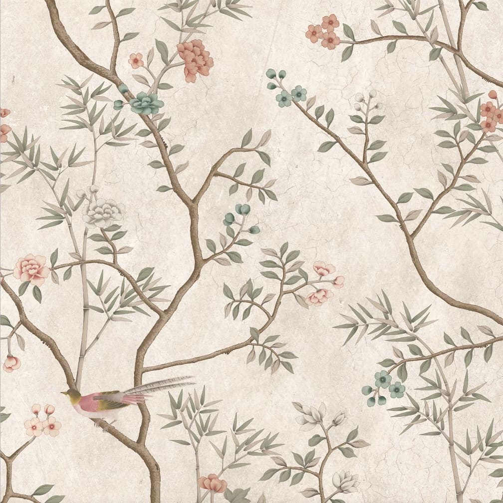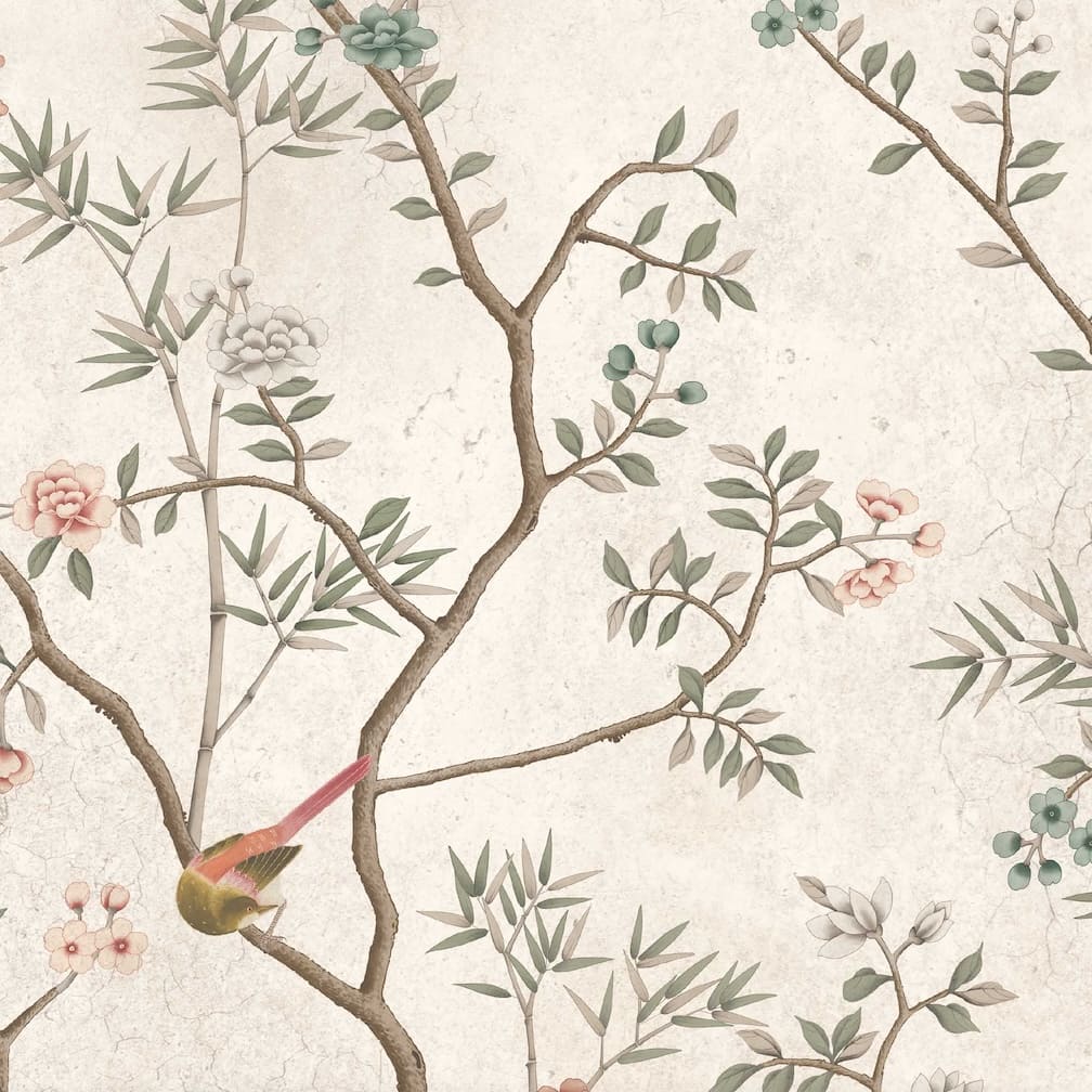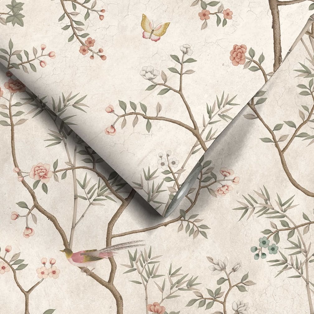 Woodchip & Magnolia’s Onism Pearl Mural Wallpaper brings a delicate harmony of nature into interiors, with hand-drawn Chinoiserie motifs creating a serene, dreamlike atmosphere. Softly arching branches cradle finely detailed blossoms, while butterflies flutter between petals and an exotic bird perches gracefully, its pastel-hued feathers complementing the warm beige backdrop. Muted greens, gentle corals, and blush pinks weave an elegant interplay of colour, evoking the poetic charm of antique decorative art.