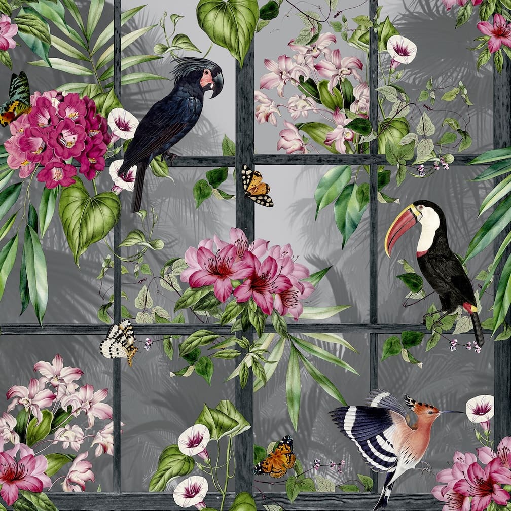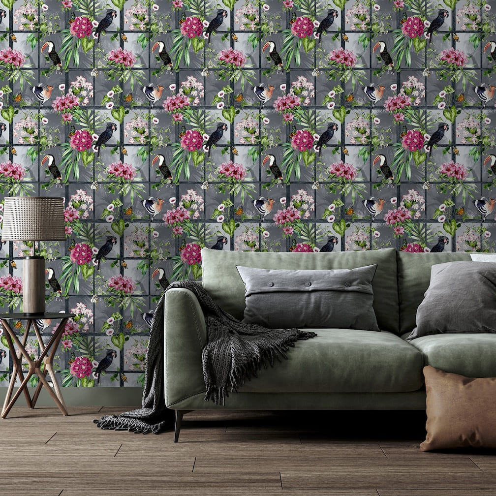 Bring your walls to life with the vivid beauty of the Arthouse Cuban Tropicana Wallpaper. Bursting with tropical flair, this bold design features colourful toucans, parrots, hummingbirds, and butterflies nestled within lush jungle foliage. Vibrant pinks and greens pop against a dramatic dark backdrop, styled like ornate window panes, adding rich depth and a sense of escape to any space. Perfect for creating a statement wall in living rooms, hallways, or creative spaces, this wallpaper brings exotic charm and artistic energy to your décor.