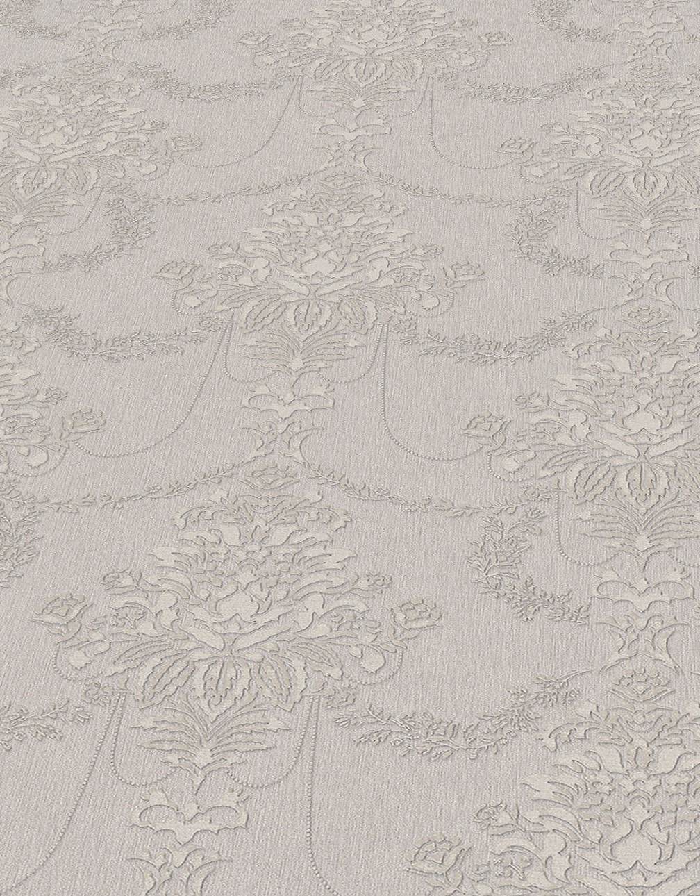 smann Felicite Floral Ornament Grey Metallic Wallpaper showcases an intricate motif of flowers, leaves, and elegant swirls, creating a pattern reminiscent of fine textiles. The soft grey tones combined with subtle metallic highlights add depth and a sophisticated shimmer, making it a versatile choice for both modern and vintage interiors.