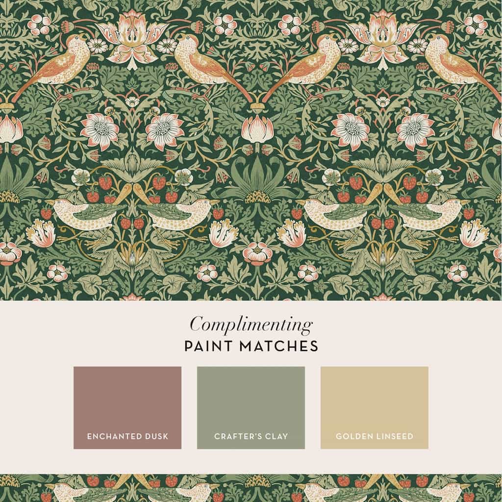 Coordinate and combine this William Morris wallpaper with the perfectly matched William Morris emulsion or eggshell paint for a seamless, stylish finish. The ideal paint colours to pair with this design are Enchanted Duck, Crafter’s Clay, and Golden Linseed—creating a beautifully cohesive and curated decor.
