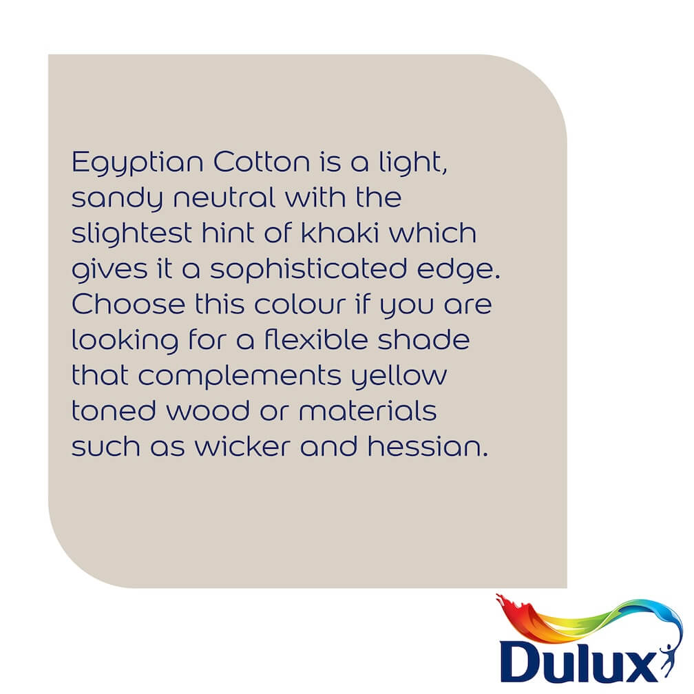 Dulux Easycare Washable Matt Paint – Egyptian Cotton is a light, sandy neutral with a subtle hint of khaki, giving your walls a sophisticated and versatile look. This flexible shade works beautifully with yellow-toned woods or natural materials such as wicker and hessian, making it ideal for creating warm, inviting interiors.