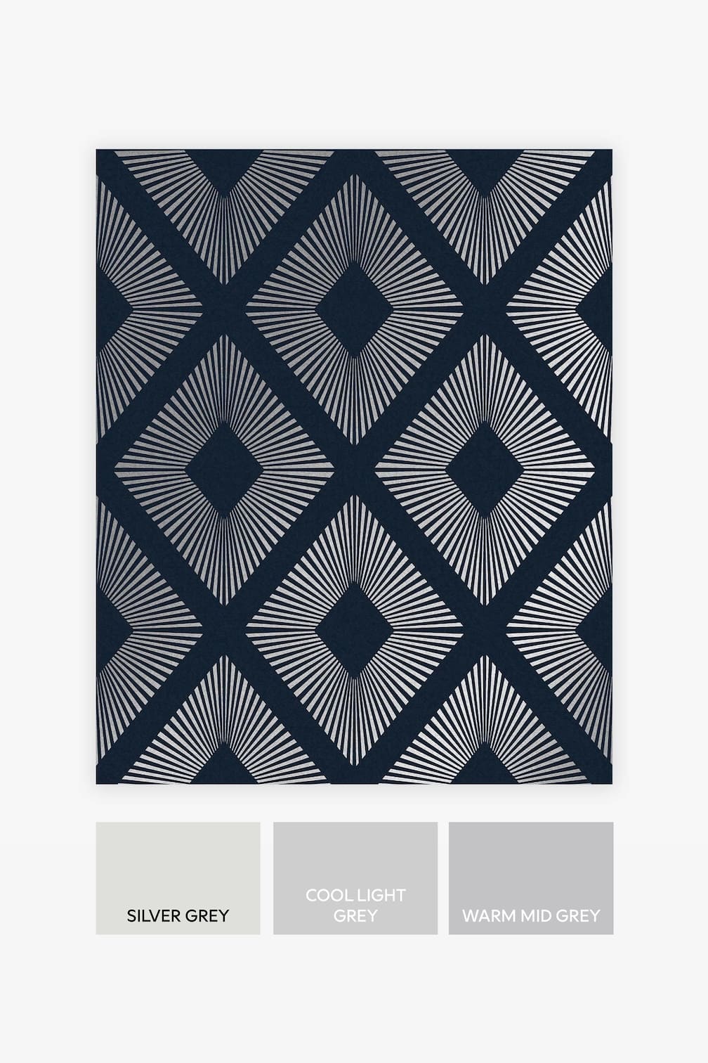 Next Deco Triangle Navy Wallpaper - Add luxury and glamour to your walls with Deco Triangle Navy, this glamorous wallpaper design features a maxi geometric triangle in a statement silver metallic beautifully sat upon a deep navy background. Adding even more luxury, this statement design is printed on a fibrous paper which adds subtle texture whilst also being paste the wall meaning easy to hang.