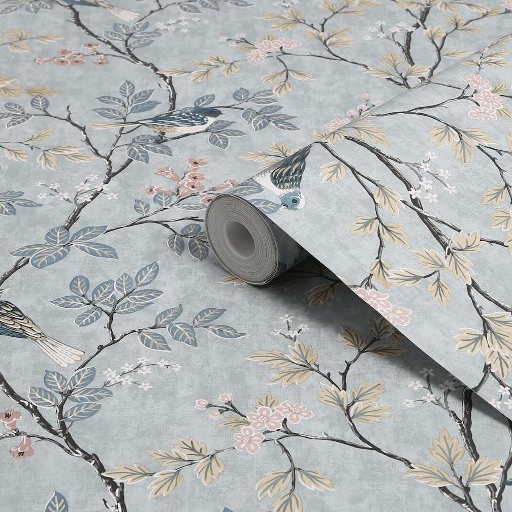 A delicate bird design with structured branches and foliage, a muted blue background tone with small hints of pinks and terracotta. It would make a striking accent wall in any room or pair with a timber panel below for a dramatic hallway entrance.