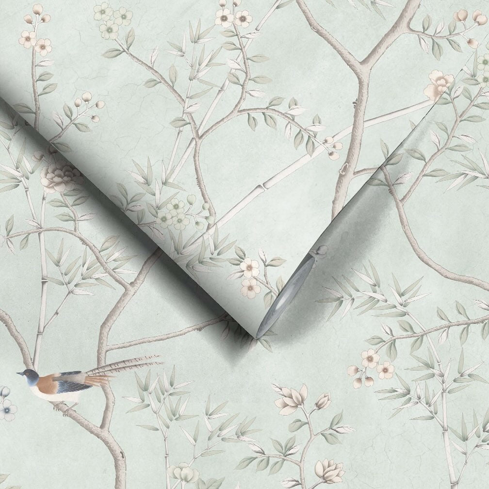 Onism Ocean Mural Wallpaper by Woodchip & Magnolia blends Chinoiserie artistry with the quiet majesty of nature. Delicate bamboo stalks reach upward, their muted olive and beige leaves unfolding gracefully, while clusters of pale blue and cream blossoms add an ethereal softness. A poised bird, resplendent in navy and warm beige, perches thoughtfully amidst the foliage, evoking a sense of quiet wonder. The soft sage green backdrop, reminiscent of early morning mist, enhances the wallpaper’s soothing, timeless elegance, creating a restful yet evocative interior.